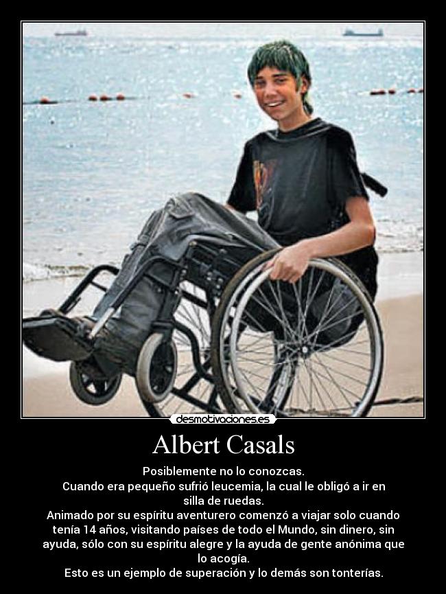 pregunta qué te pasa, de dónde vienes, y así haces un montón de amigos.Albert perdió su capacidad de caminar a los ocho, por culpa de una leucemia grave. Pasó la mitad de su infancia en una cama de hospital, viendo cómo se iban desvaneciendo sus opciones de saltar en ella. Alex, su padre, fue de librería en librería comprando libros de matemática, física, filosofía y sociología. Ejerció a la vez de padre, profesor, y compañero de pupitre del hijo postrado. Leyeron juntos, compartieron dudas y aprendieron a la par. Cuando Albert descubrió que su pasión era viajar, simplemente inició el camino. Al cumplir los catorce años, pidió a sus padres permiso para cruzar Europa sin un solo euro en el bolsillo ni nadie a su lado. Él con su silla. Y así empieza esta historia.