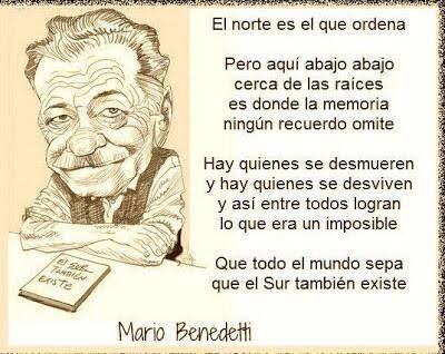 Con su ritual de acerosus grandes chimeneassus sabios clandestinossu canto de sirenassus cielos de neónsus ventanas navideñassu culto a dios padrey de las charreterascon sus llaves del reinoel norte es el que ordenapero aquí abajo abajoel hambre disponiblerecorre el fruto amargode lo que otros decidenmientras que el tiempo pasay pasan los desfilesy se hacen otras cosasque el norte no prohíbecon su esperanza durael sur también existecon sus predicadoressus gases que envenenansu escuela de chicagosus dueños de la tierracon sus trapos de lujoy su pobre osamentasus defensas gastadassus gastos de defensason su gesta invasorael norte es el que ordenapero aquí abajo abajocada uno en su esconditehay hombres y mujeresque saben a qué asirseaprovechando el soly también los eclipsesapartando lo inútily usando lo que sirvecon su fe veteranael sur también existecon su corno francésy su academia suecasu salsa americanay sus llaves inglesascon todos sus misilesy sus enciclopediassu guerra de galaxiasy su saña opulentacon todos sus laurelesel norte es el que ordenapero aquí abajo abajocerca de las raíceses donde la memorianingún recuerdo omitey hay quienes se desmuereny hay quienes se desviveny así entre todos logranlo que era un imposibleque todo el mundo sepaque el sur también existe.